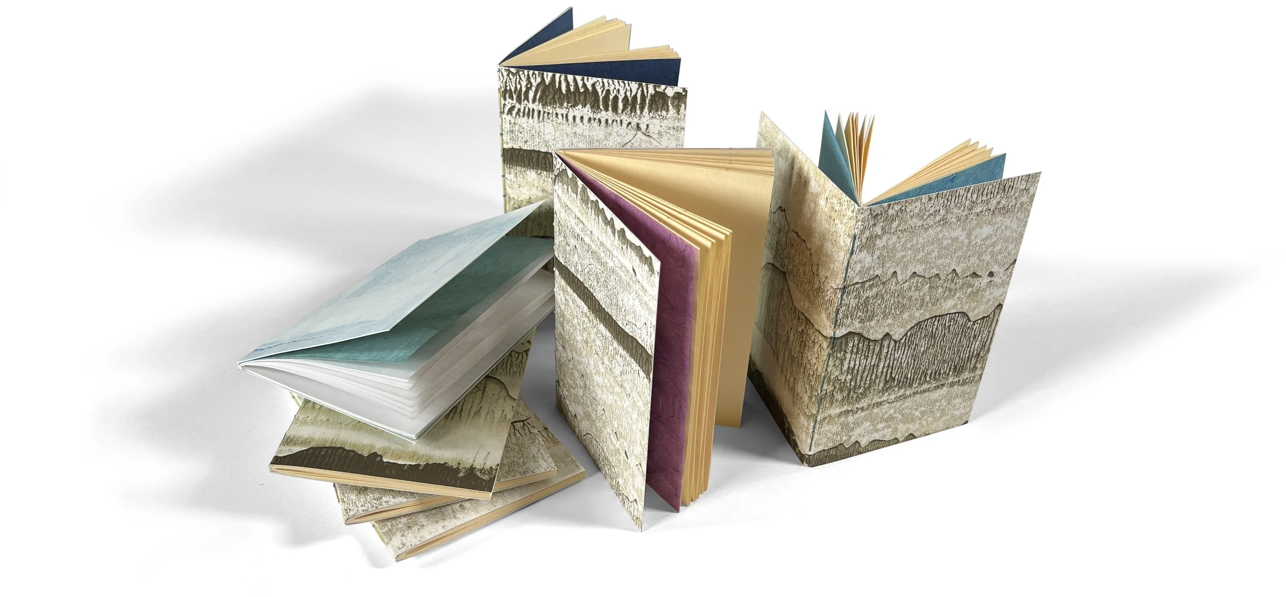 Several years ago, we made dozens of these 3.875” x 5.875” notebooks, and a good, critical friend, Bernie Herman, bought a couple of dozen. After that, we started calling them “Bernie Books.” He scribbled in them about all kinds of subjects, from Southern food recipes to raising oysters. Bernie passed away in December 2025. Eventually, we sold all of what we called “Bernie Books.” So we decided to remake them with a few updates. The first of these will have “ink pull” covers, a fly-sheet of various configurations, various inside pages, and be bound with a “string-of-pearls” stitch. Once we get a dozen or so, we’ll put them in our online store.