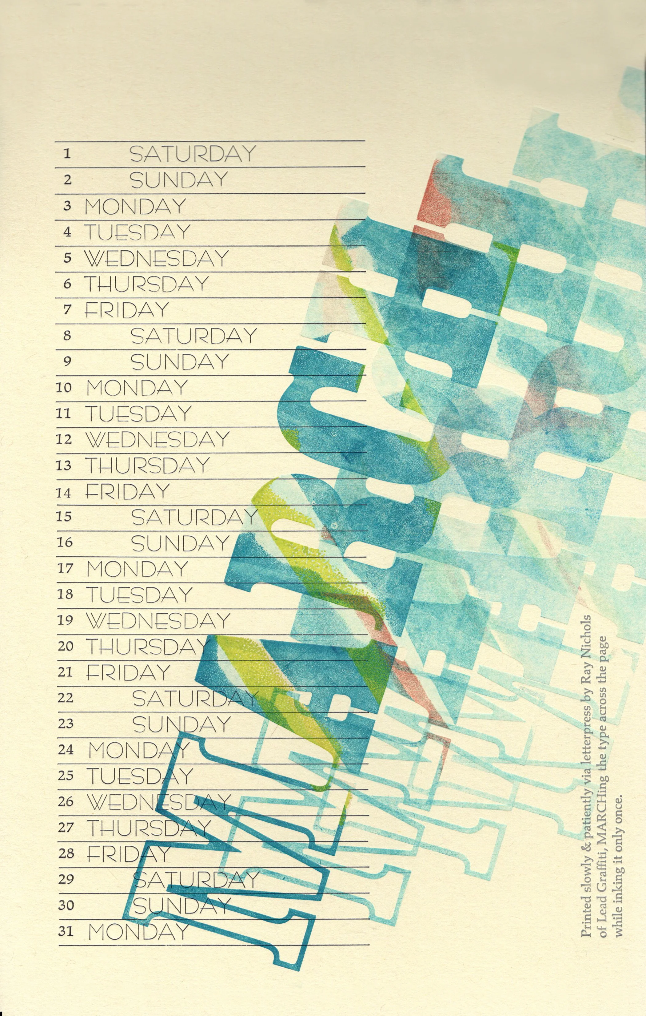We’ve often collaborated with groups to produce calendars. We often use the opportunity to experiment with a printing technique we’ve had banging around in our heads. We also often challenge the readability of the calendar page as a calendar, much to the chagrin of some of the other printers.